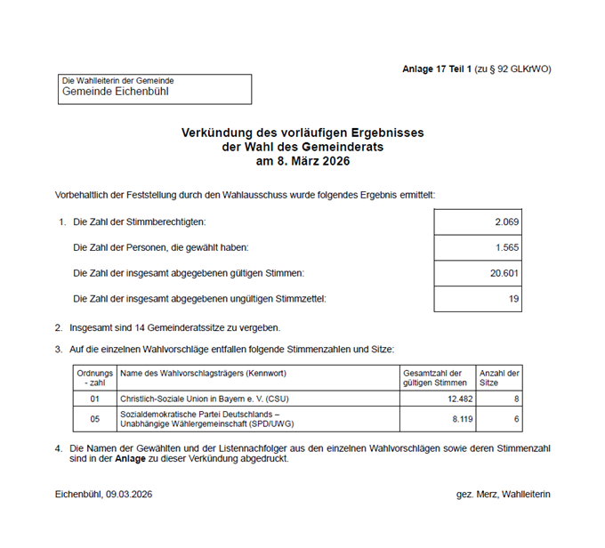 Verkündung des vorläufigen Ergebnisses der Wahl des Gemeinderats am 8. März 2026